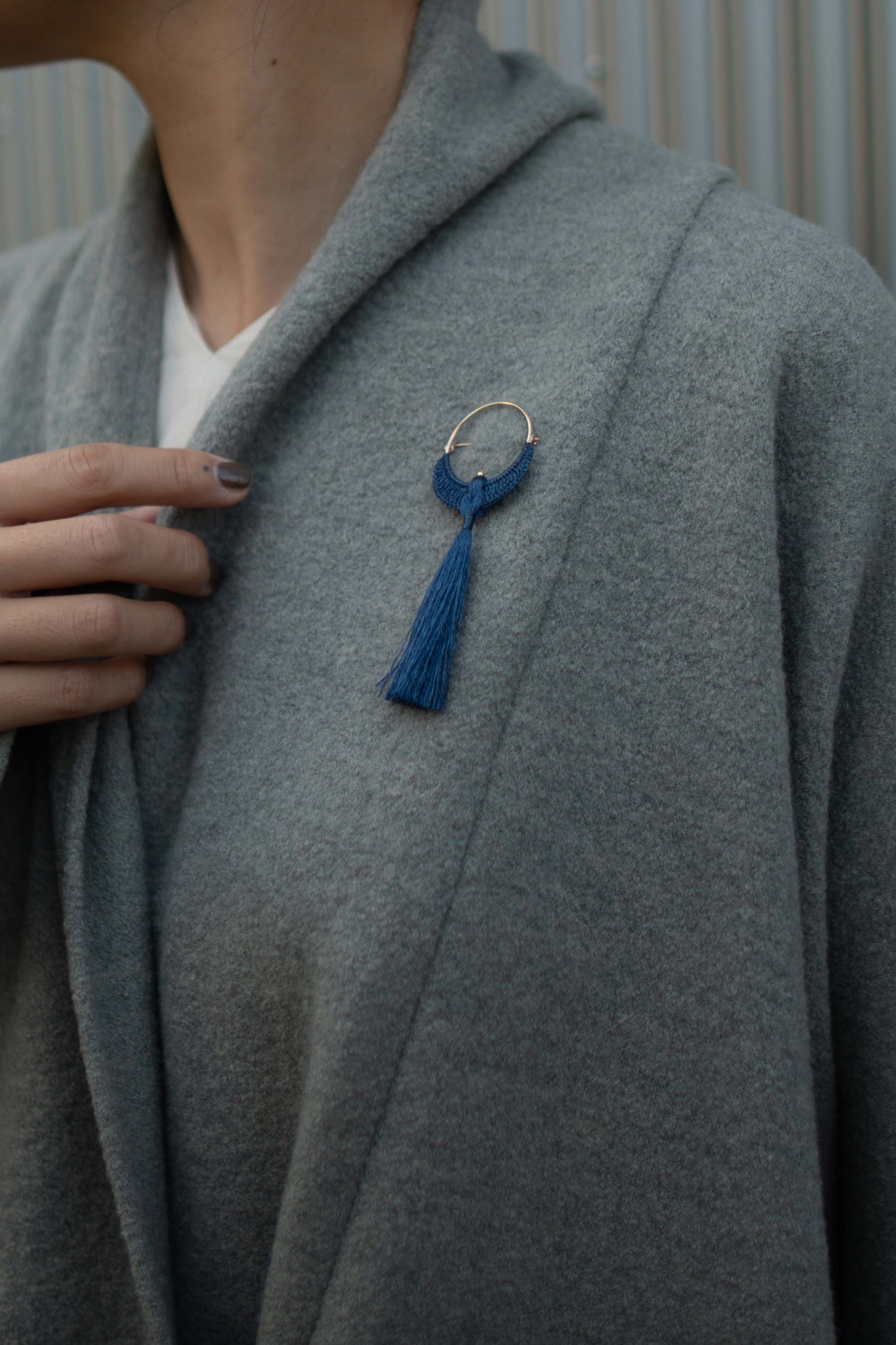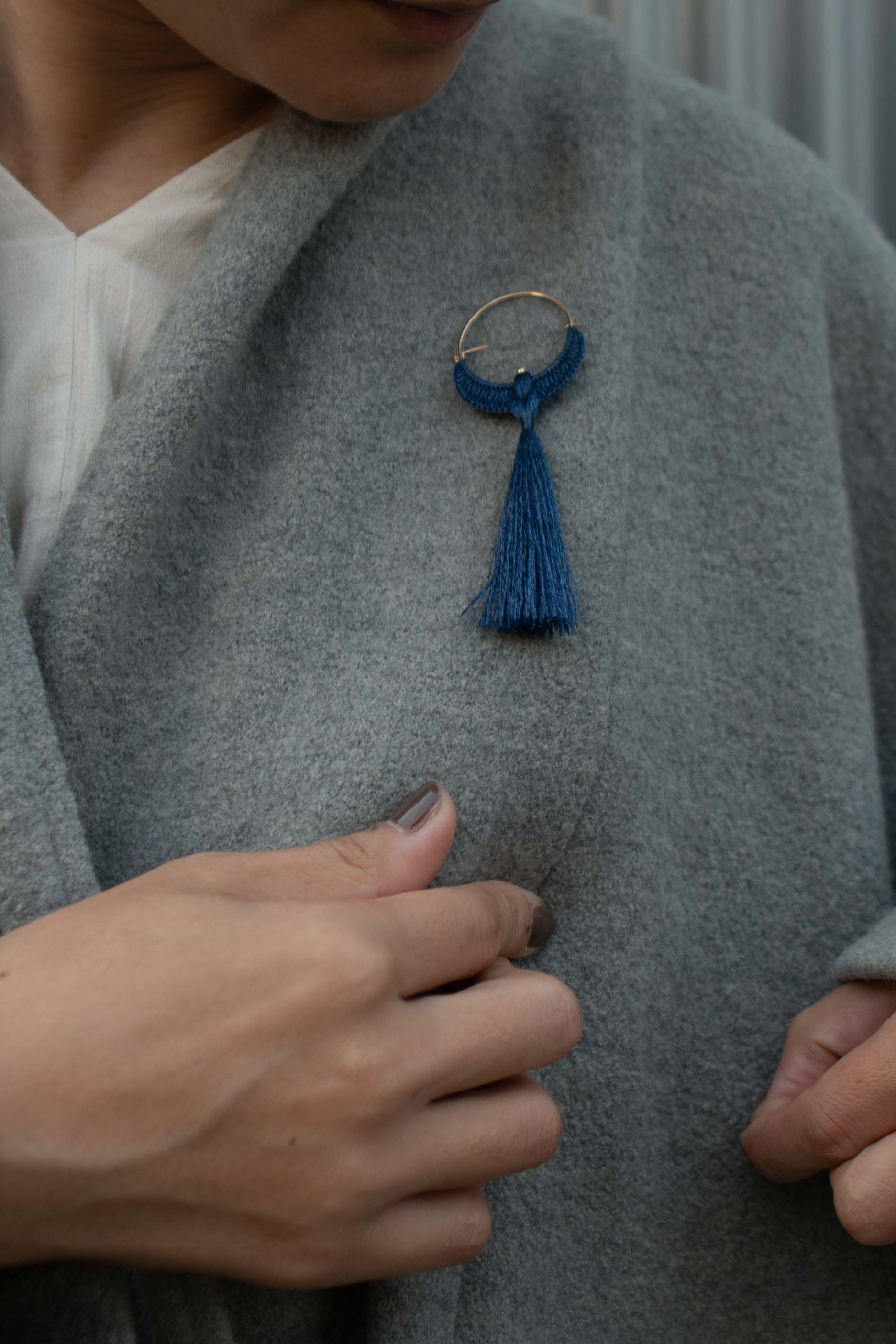 野生の蚕の繭から紡いだオリジナルのワイルドシルク糸を、一羽ずつ丁寧に編み上げています。 装身具として身につけたときと同じように、鏡に映る自分の姿や、ふとした仕草の中で、気持ちがふわりと軽くなるような存在です。